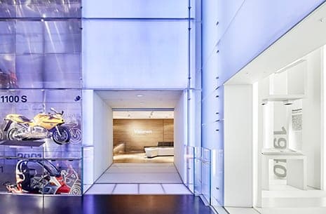 Final öffnet sich der Raum an der Stirnseite mit einem virtuellen Fenster in die Zukunft. Die filmische Präsentation mit 4K-Technologie verstärkt das Empfinden der räumlichen Tiefe. Großflächige Bildwelten lassen den Besucher am Hier und Jetzt der BMW Group im Kontext visionärer Megatrends teilhaben. Der Besucher erlebt das Zukunftsmoment unmittelbar.