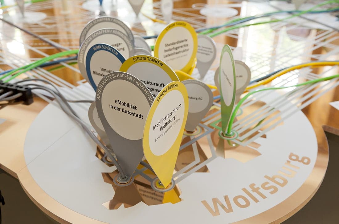 Was zunächst vollständig chaotisch und überfüllt wirkt, entpuppt sich bei näherer Betrachtung als strukturierter Plan. Die vier Städte Hannover, Braunschweig, Göttingen und Wolfsburg werden wegen der hohen Dichte der Projekte und Institutionen vergrößert dargestellt. So entsteht das Bild des dichten Netzes der Aktivitäten im Rahmen des „Schaufensters Elektromobilität“ in der Fläche und in den Städten der Region. Eine Medienwand liefert zusätzlich täglich wechselnde Kurzinformationen zur Elektromobilität.
